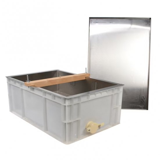 - Voksen havner på den perforerte bunnen i metallkaret, mens honningen renner gjennom og samles i plastkassen.
