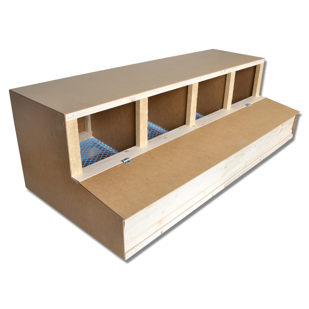 Det er konstruert slik at eggene ruller ned på et nett og dermed blir utilgjengelige for hønene.