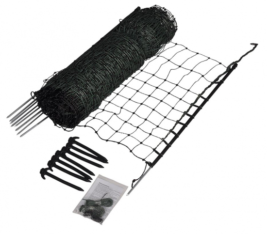 9 stk svarte stolper, 25 mGjerdenett for kaniner og andre små husdyr. Kan også brukes for å beskytte hagen eller åkeren. Komplett og enkelt å koble til flere nett. Lengde 25 m, 9 stolper.