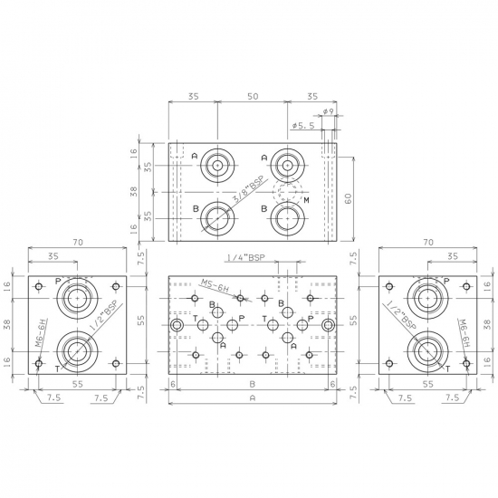 CETOP 3/NK6 Basisplate 3/8" 2-seksjoner