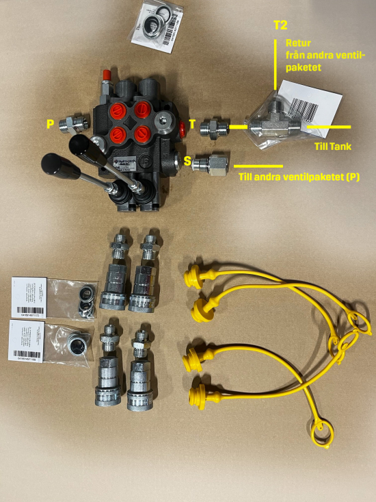 OBS: Om du ønsker å sette hurtigkoblinger ikke direkte på ventilpakken og koble dem i stedet med slanger, trenger du flere han/hann adapter (2 stykker til).