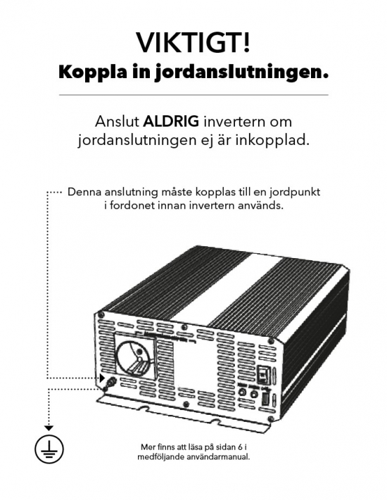 Inverter: 1 500 W, DC?AC, 24 V?240 VMonteringsinformasjonViktig! Koble inn jordingsforbindelsen. Koble aldri til inverteren hvis jordingsforbindelsen ikke er tilkoblet.Opprinnelsesland: TWTollkode: 85167920 - I produktgrupper