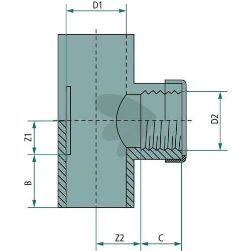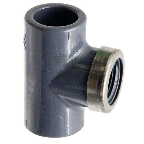 T-stykke med 2x limhylse og 1x innvendig gjenge, PVC-U