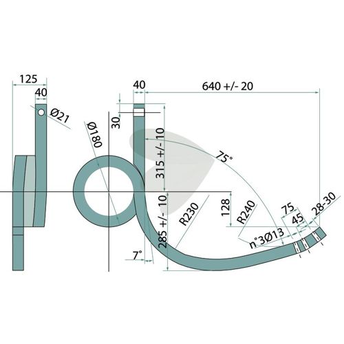 Pinn tung kultivator venstre, vridd 640X310X180mm