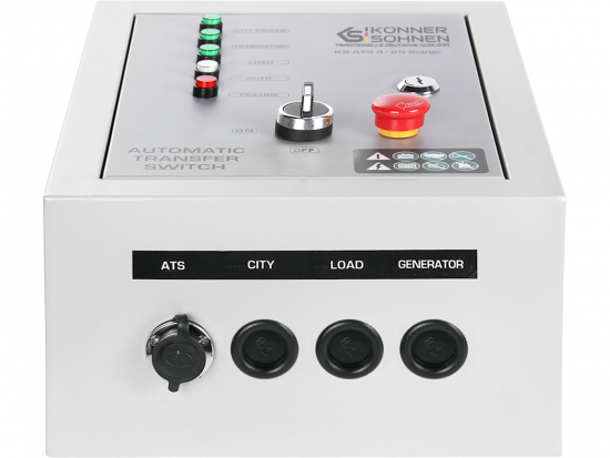 LagerstatusArtikkelnummerKSATS4_25GASOLINEProdusentKönner & SöhnenEgenskaperKS ATS 4/25 Gasoline ATS (Automatic Transfer Switch) enheten fra det tyske merket “Köner & Söhnen” starter automatisk generatoren og overfører lasten til den når hovedstrømkilden slås av og stopper automatisk generatoren når den sentrale strømforsyningen gjenopprettes. Den er kompatibel med bensininvertergeneratorer som er utstyrt med en 8-pinskobling for en automatisk overføringsenhet (ATS-inngang). ATS-enheten har en PLC for å programmere motorens starttid etter strømbrudd, motorens oppvarmingstid før tilkobling av strømforbrukere samt for å signalisere feil. Den har en nødstoppknapp for generatoren. ATS-enheten kan fungere både i automatisk og manuell modus.Maksimal effektforbruk, i standby-modus: 0,36 W, i driftsmodus: 1,2 W