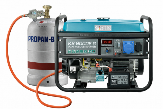 DUAL FUEL-serien LPG/bensindrevne generatorer fra Könner & Söhnen er blant de mest populære takket være høy effektivitet og miljøvennlighet. Generatoren kan drives både med bensin og flytende gass (propan-butan).