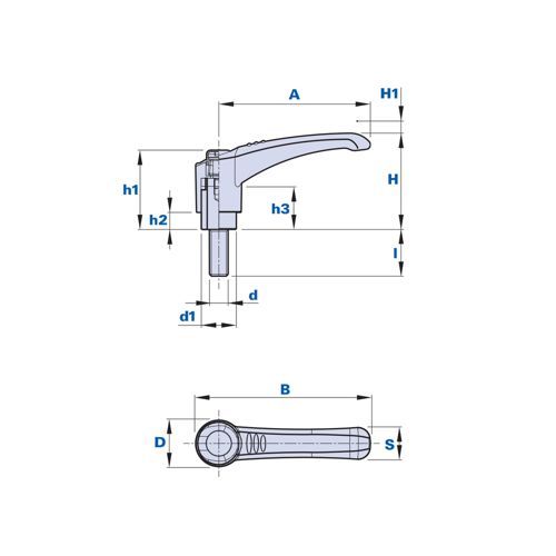 - mål: A=45mm, B=53mm, D=16mm, S=10,5mm, H=33,5mm, H1=3,5mm, h1=29mm, h3=18mm, d1=12mm, h2=7,5mm, d=M5, I=20mm
